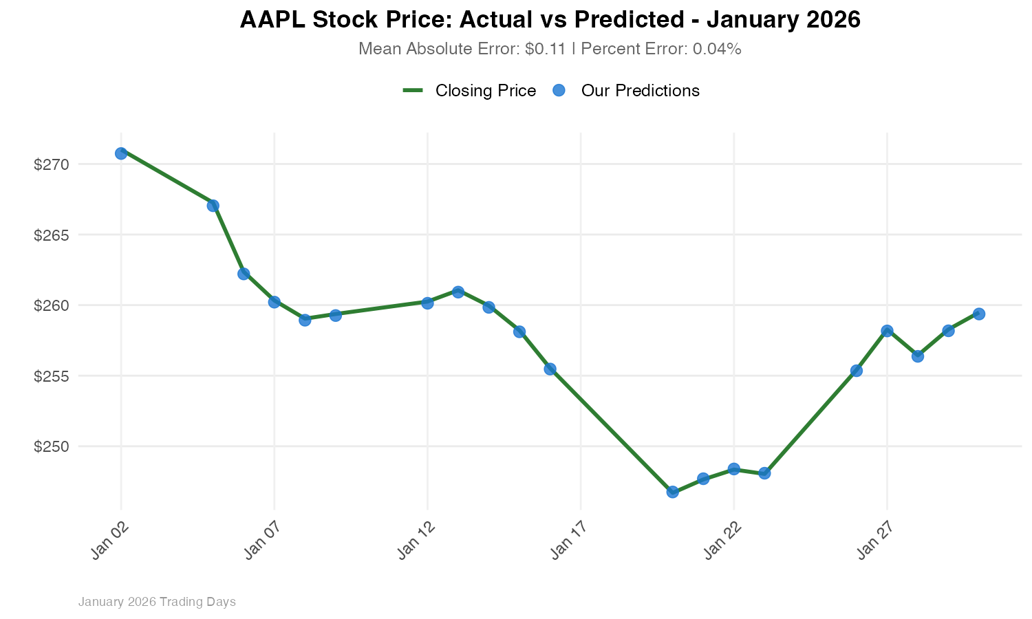 Our stock price prediction model’s performance for January 2026 corresponding to a Mean Absolute Error of $0.11 and an average percent error of 0.04%. These metrics indicate how closely our predictions aligned with actual AAPL closing prices throughout the month.
