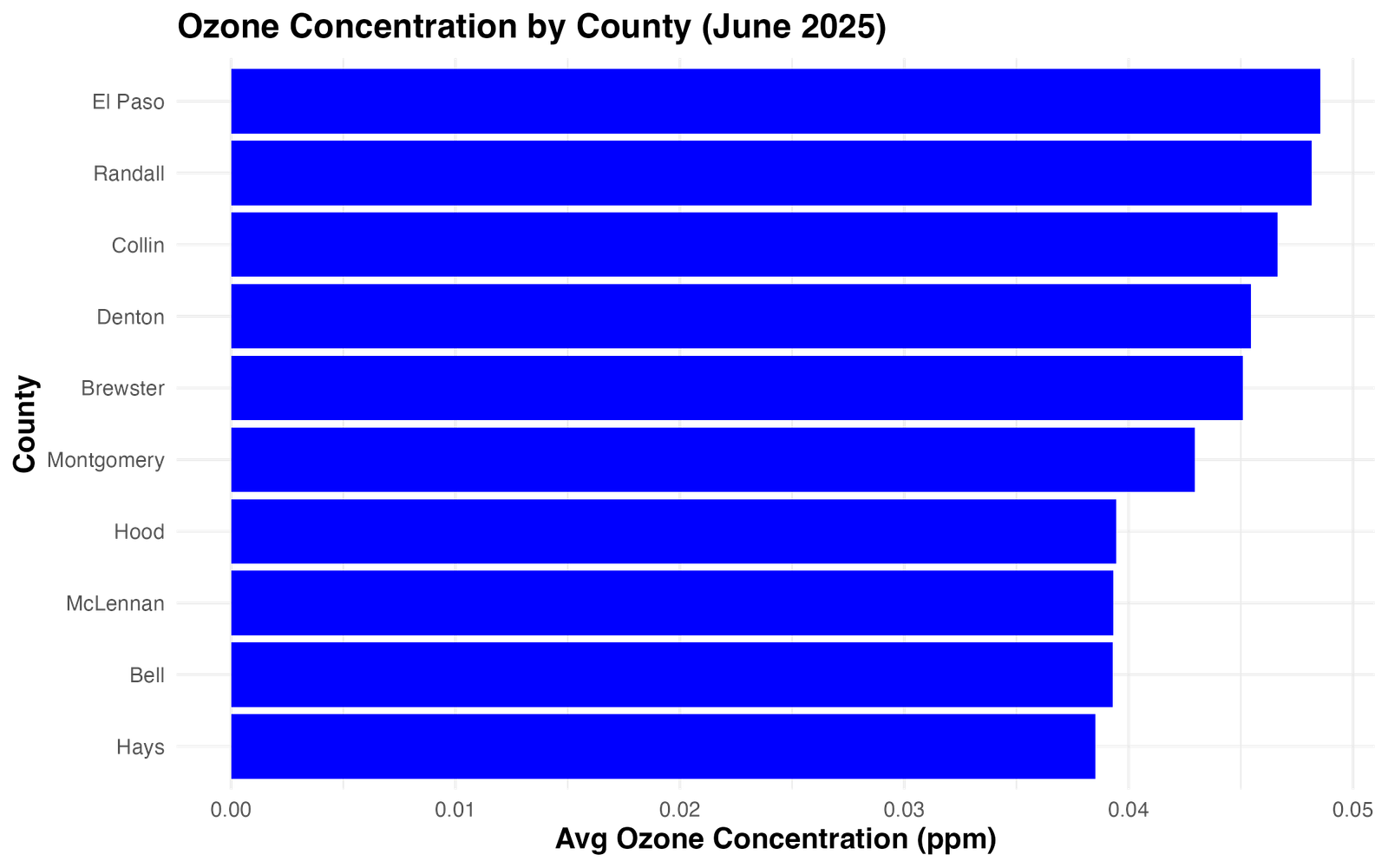 Here’s a quick look at average ozone levels across the top 10 counties in Texas with the highest overall concentrations. The chart focuses on June 2025, offering a glimpse into seasonal air quality variation