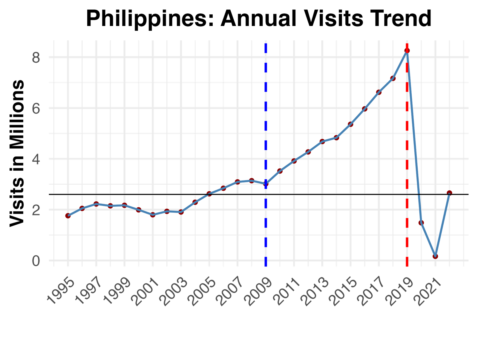 Tourism in the Philippines followed a steady upward trend from 2009 until it reached a peak in 2019. This growth was sharply interrupted starting in 2020, with a dramatic decline that coincides with the beginning of the COVID-19 pandemic. A modest recovery is evident in 2022, suggesting a gradual reopening and renewed confidence in travel to the country.