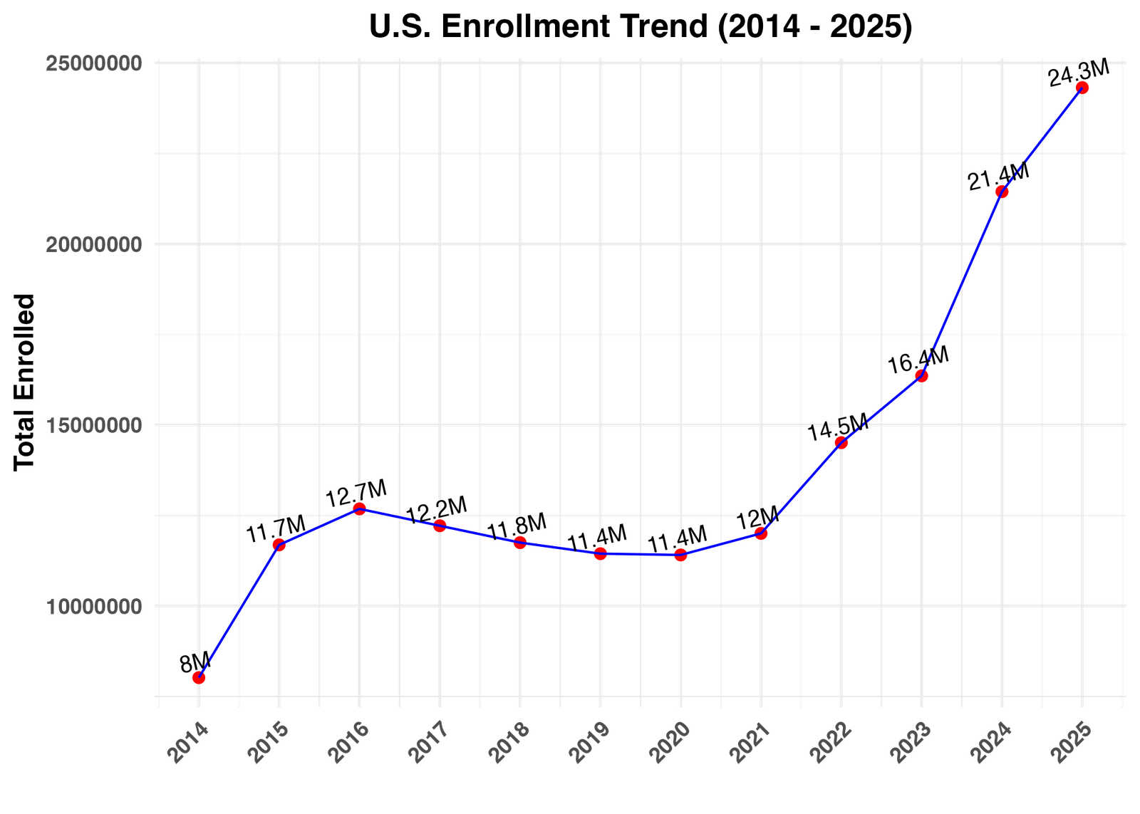 The national Health Insurance Marketplace enrollment increased from 8 million in 2014 to 24.3 million in 2025, with some dips between 2017 and 2020. This upward trajectory provides context for understanding the trends within the Midwestern states.