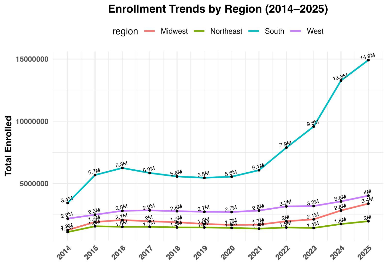 The South consistently leads all other regions, showing rapid and sustained growth, especially after 2021, reflecting expanding participation and outreach efforts. The West also displays strong upward movement, though at a steadier pace. In contrast, the Midwest and Northeast experienced slower early growth and temporary plateaus before recovering in the later years, with both regions showing renewed enrollment momentum by 2025. Overall, the data reveal an expanding national marketplace with particularly sharp gains driven by southern states.