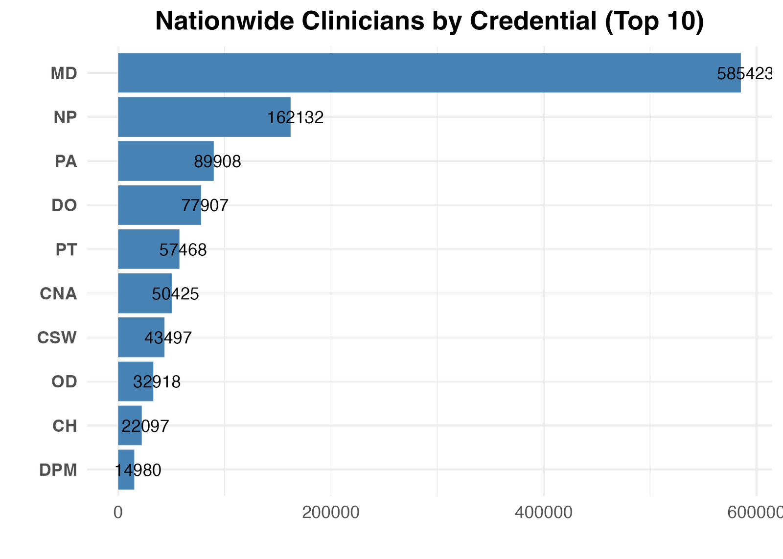Medical Doctors (MDs) remain the most common clinicians in the U.S., but Nurse Practitioners (NPs) and Physician Assistants (PAs) form a large and growing share of the healthcare workforce.