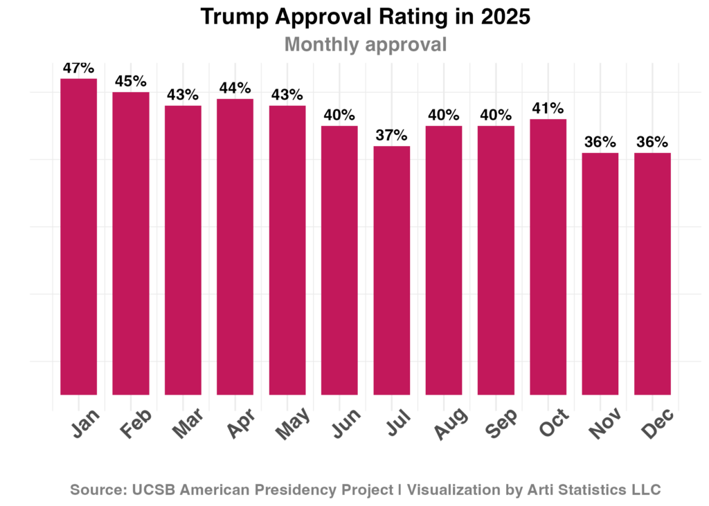 The most significant decline occurred between May and July, when approval dropped from 43% to 37%, a 6-point decline in just two months. While there was a slight recovery in August (40%), the ratings continued their descent, bottoming out at 36% in both November and December.