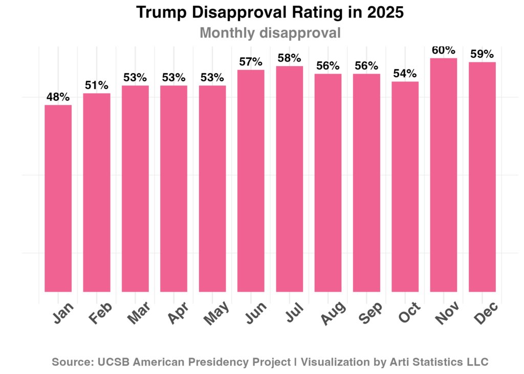By year’s end, nearly 6 in 10 Americans disapproved of Trump’s performance, while just over 1 in 3 approved. The 23-point gap between approval and disapproval in December represents the widest margin of the year, signaling sustained public dissatisfaction with his administration’s performance.