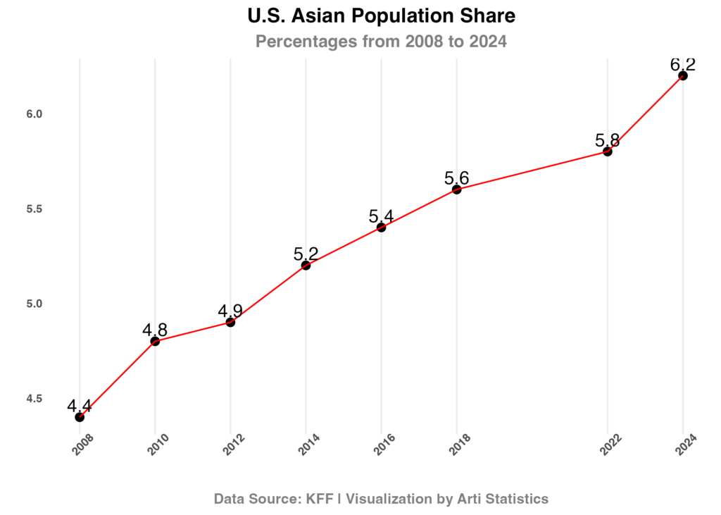 - Asian population share increased by 1.8 percentage points, from 4.4% to 6.2%