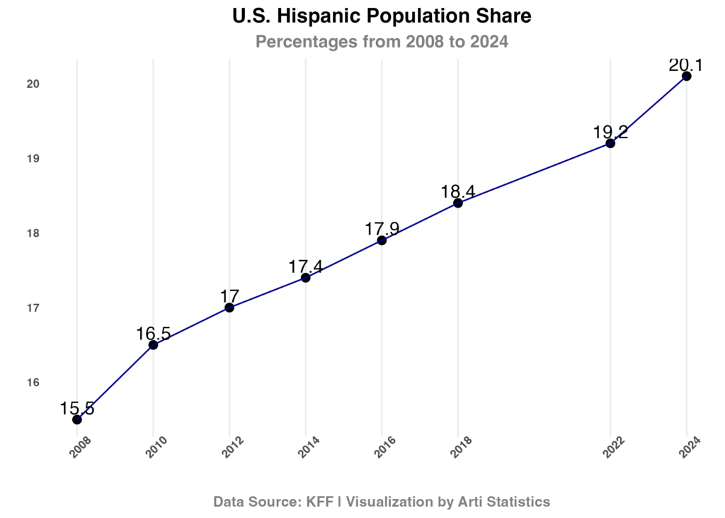Hispanic population growth mirrors this decline almost proportionally, suggesting these two trends are directly related. The Hispanic share is now approaching one-fifth of the U.S. population, a milestone with significant cultural and political implications.