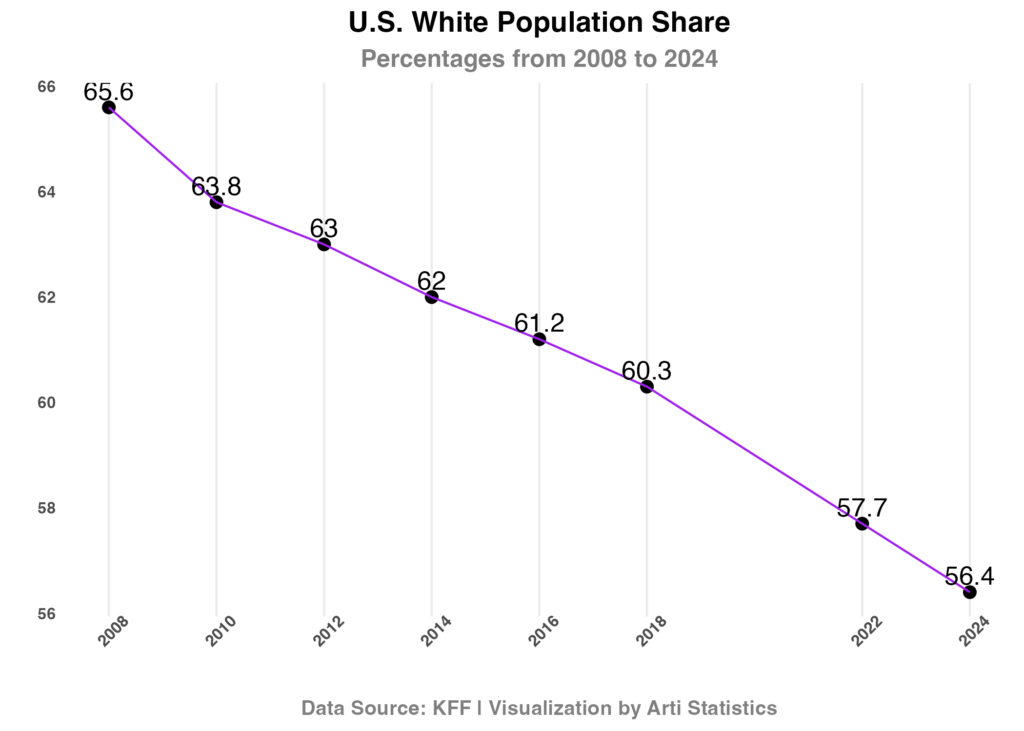 - The White population share declined by 9.2 percentage points, from 65.6% in 2008 to 56.4% in 2024