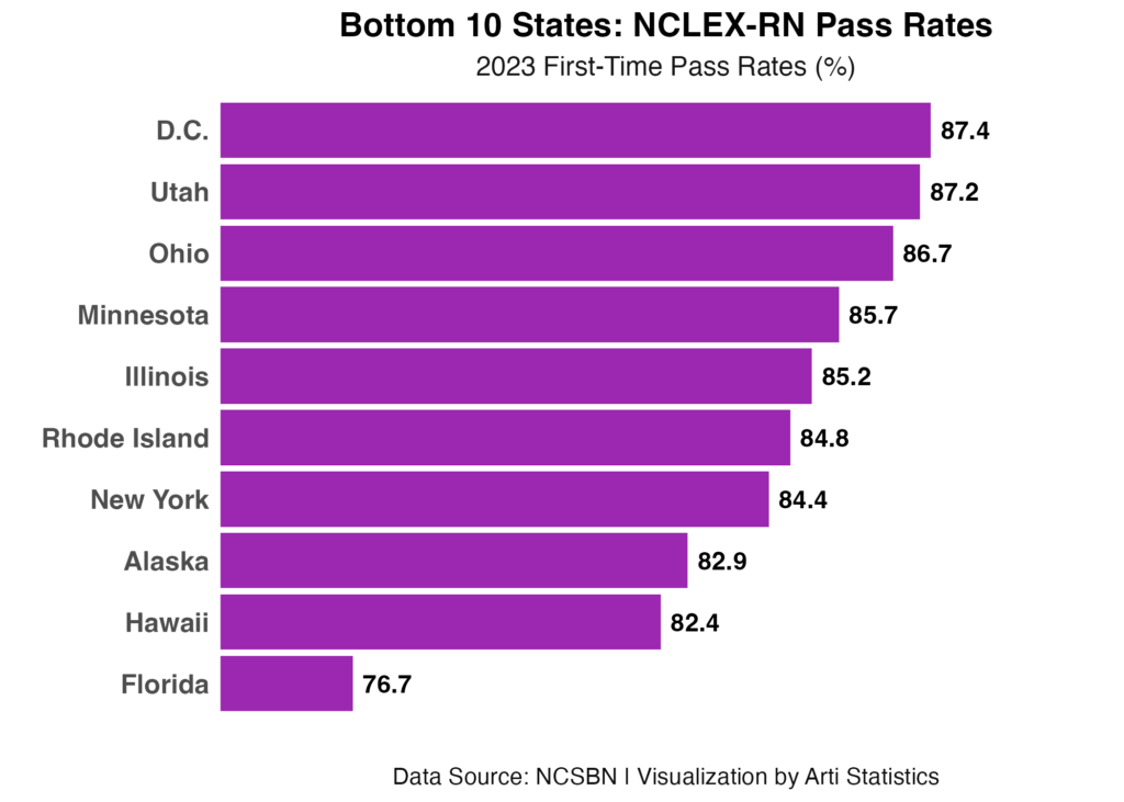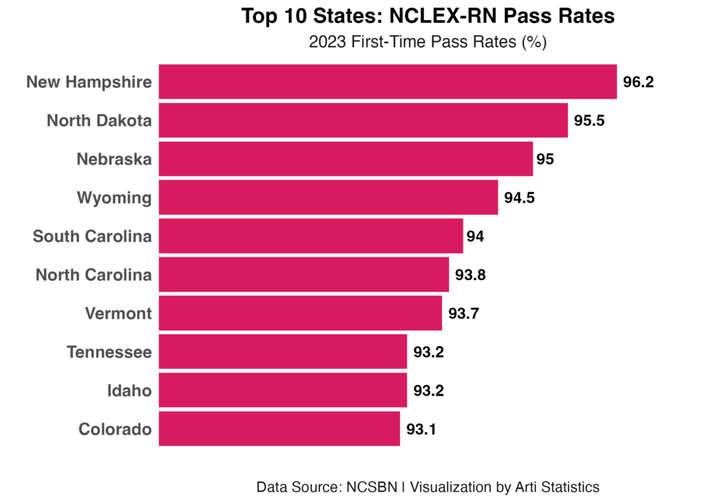 New Hampshire’s first-place finish at 96.2% reflects sustained excellence in nursing education, with North Dakota and Nebraska close behind at 95.5% and 95.0% respectively. The consistency among top performers is striking, even Colorado at #10 maintains a 93.1% pass rate, demonstrating that multiple pathways to nursing education excellence exist across diverse state contexts.
