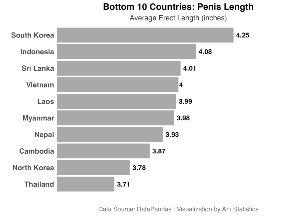 Thailand home of the world’s smallest penis size in this dataset, is also one of the most visited and beloved countries on earth. South Korea gave us Samsung, K-pop, and world-class cinema. Vietnam’s economy has been booming for decades.