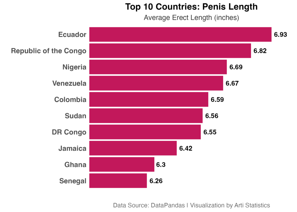 Ecuador leads the world with an average erect penis size of 6.93 inches, followed closely by Congo at 6.82 inches and Nigeria at 6.69 inches. Eight of the top 10 countries are in Latin America or Sub-Saharan Africa, a geographic concentration that points to something consistent and measurable across these populations.