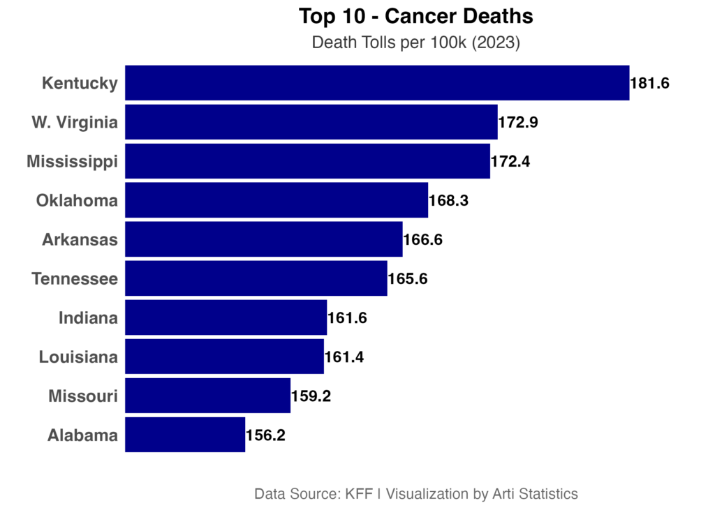 - Kentucky leads the nation with the highest cancer death rate at 181.6 per 100k. significantly above the national average (141.8).