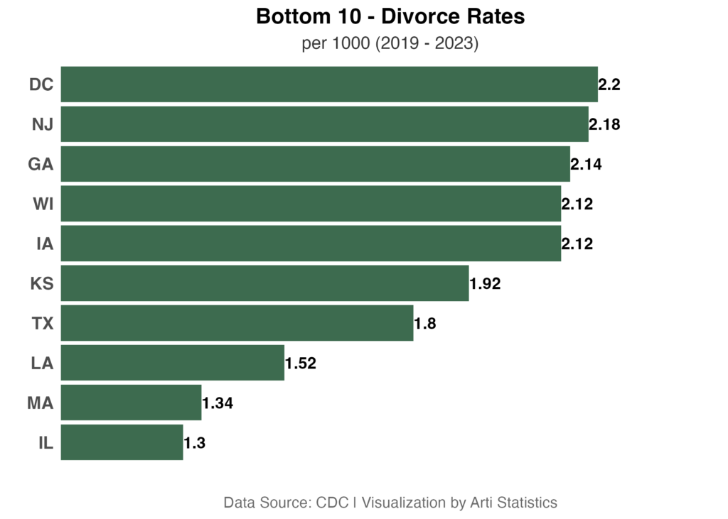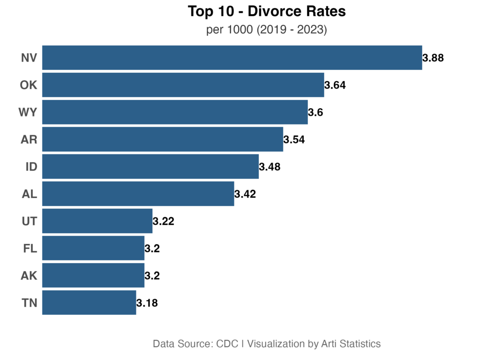 Utah at #7 is the most interesting outlier. Despite a culture strongly centered on family and faith, economic pressure on young couples and early marriage ages appear to outweigh those protective factors.