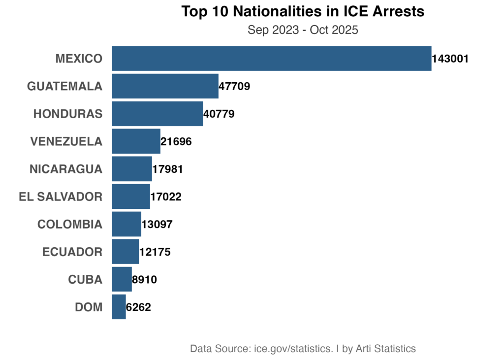 The dominance of Mexican nationals in ICE arrest data is not surprising given the length and permeability of the US-Mexico border. However, the composition of the rest of the list tells a broader story about migration patterns in the Western Hemisphere over the period covered.