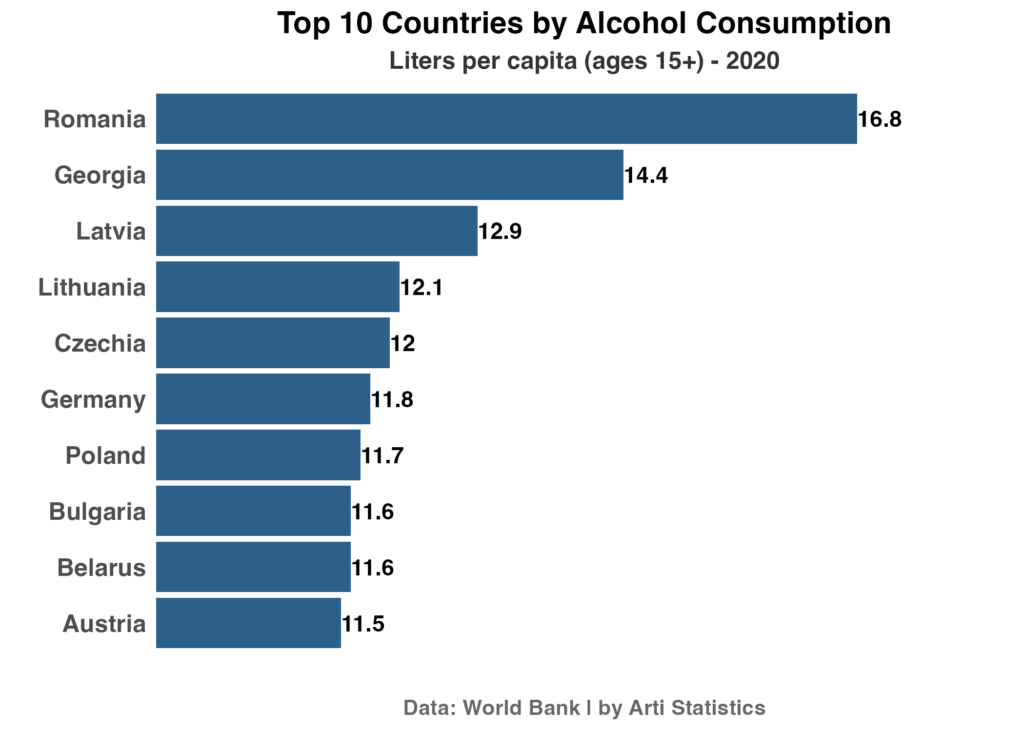 - Romania leads the world at 16.8 liters of pure alcohol per capita annually