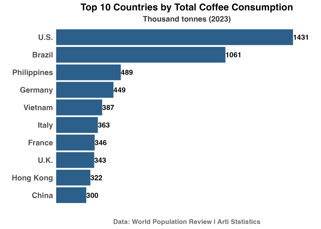 Brazil’s position at 1,061 thousand tonnes is notable given it’s also the world’s largest coffee producer. The country both grows and drinks massive quantities, with coffee deeply embedded in daily social rituals from bustling São Paulo cafés to rural farming communities.