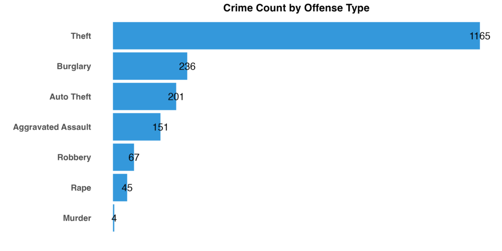 This chart shows the frequency of each major crime type reported during the period, based on FBI Uniform Crime Reporting classifications.