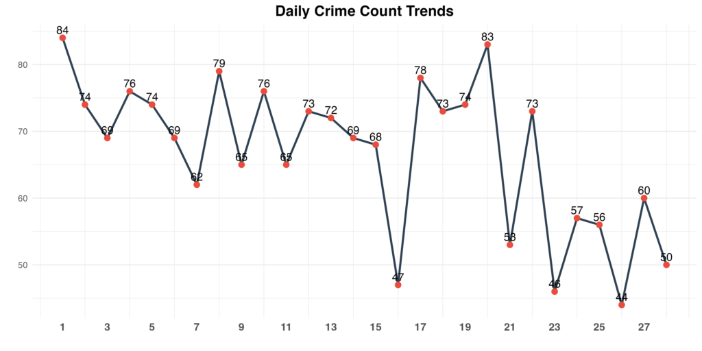 Crime occurrence varies throughout the month, with some days seeing higher activity than others. These daily trends can reveal patterns related to day of the week, local events, or environmental factors.
