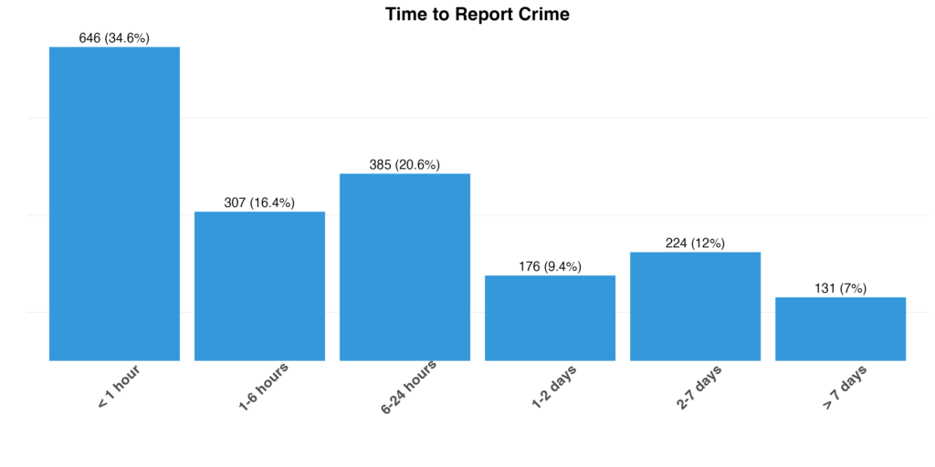 The time between when a crime occurs and when it’s reported varies significantly. Some crimes are reported immediately, while others may not be discovered or reported until hours or even days later.