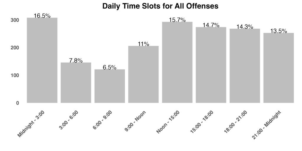 Recognizing these patterns provides insight into how criminal activity ebbs and flows throughout the typical day.