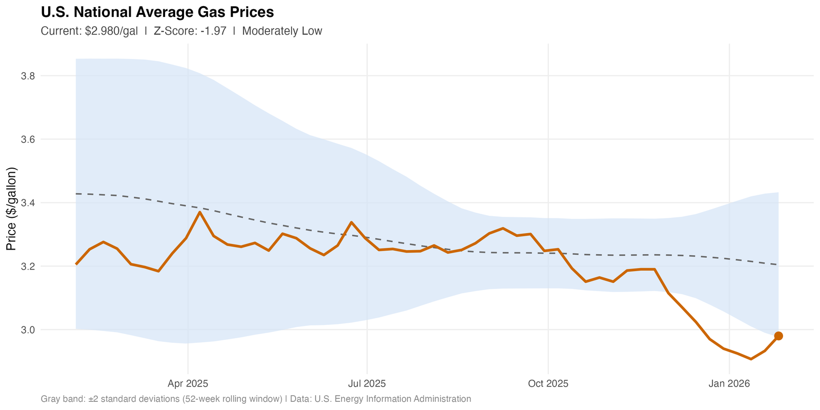 This report evaluates U.S. national average retail gasoline prices as of January 26, 2026, using weekly data from the Energy Information Administration (EIA). Rolling 52-week statistical benchmarks are applied to both price levels and week-over-week changes to distinguish structural price trends from short-term volatility. Z-score analysis is used to identify when current values deviate meaningfully from recent historical patterns.