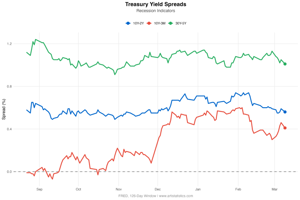 - The 10-Year minus 3-Month Treasury Spread from FRED stands at 0.41% (Normal) – Higher than 73.24% of the past 126 reported values, with Moderate Downward Movement of -0.05 basis points (-10.87%) from the previous reported value.”